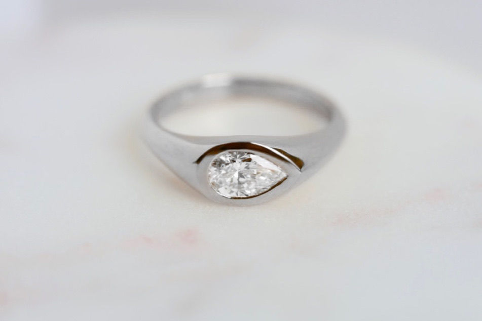 The sideways placement of the pear shape stone on the hand mimics a droplet falling from the glass whilst the wearer is holding their drink.